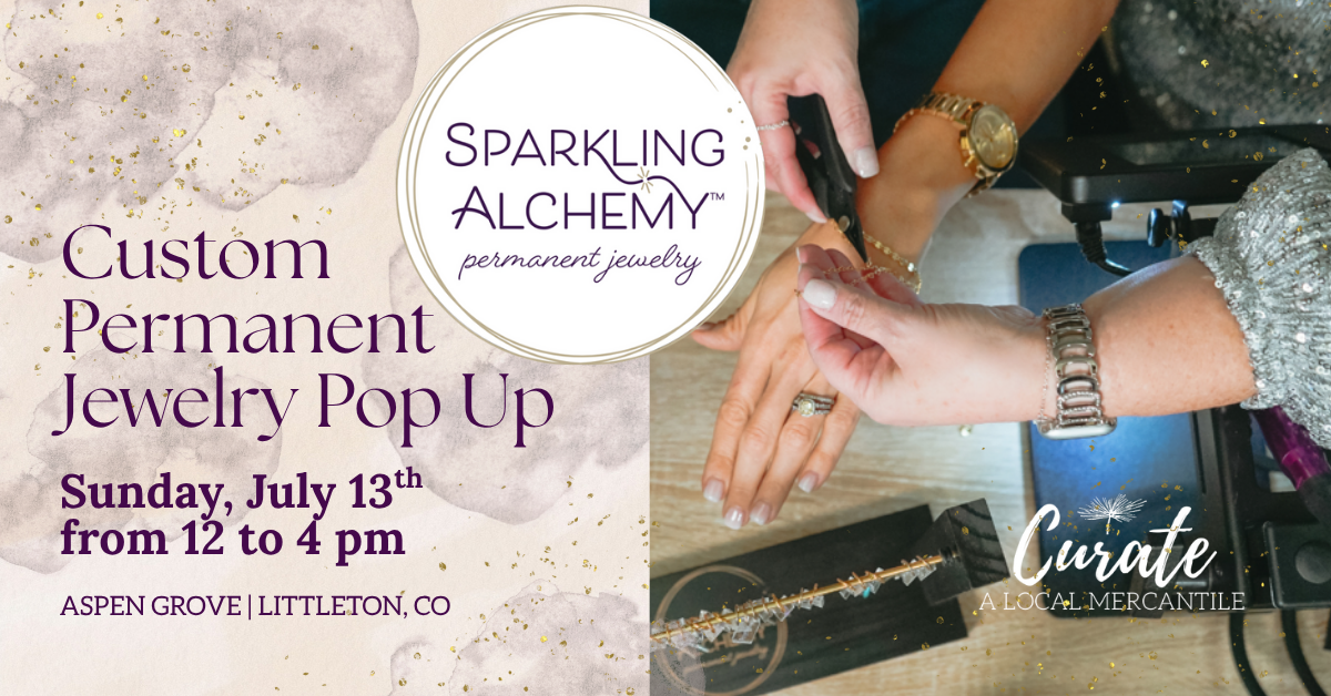 Join Sparkling Alchemy at Curate Mercantile in Aspen Grove on Saturday, July 13 from 12–4 PM for a stylish summer pop-up full of charm, community, and custom sparkle.